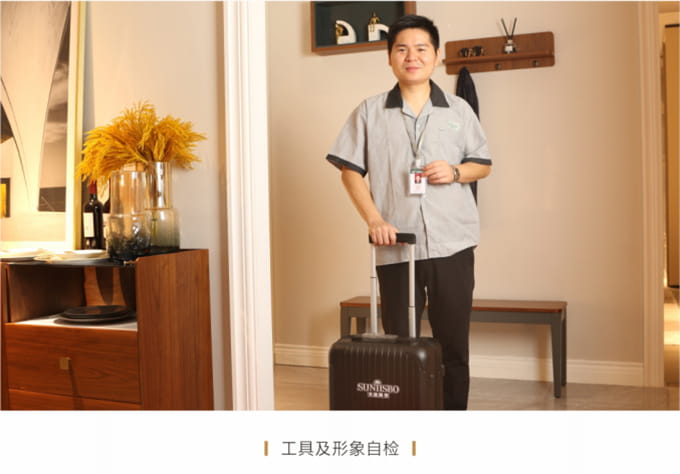 物資準(zhǔn)備:上門前必須著圣蒂斯堡統(tǒng)一工作服,佩戴工作證,準(zhǔn)備好安裝工具、搬抬工具(搬運(yùn)背帶等)、備件、筆記本、手套、鞋套、地墊、衛(wèi)生清掃工具(清潔劑、抹布、掃把簸箕、拖把、吸塵器等)、瓶裝水、《圣蒂斯堡安裝施工指示牌》、收據(jù)和圣蒂斯堡產(chǎn)品說明書、《產(chǎn)品配送單》和《配送滿意度調(diào)查表》等物品。再帶上小禮品,例:鮮花或碳包去味禮包等。