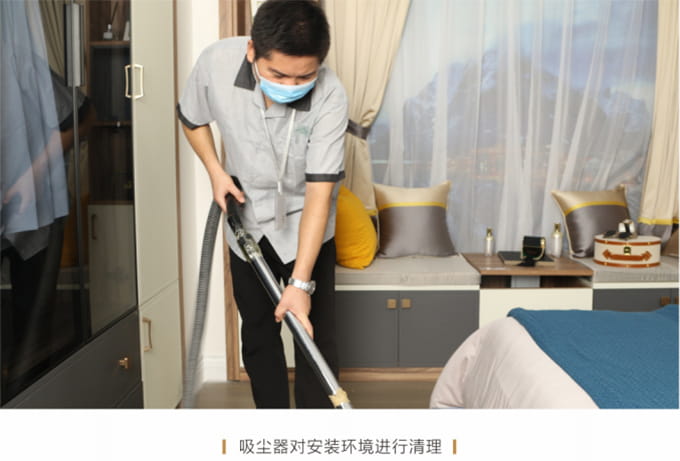 產(chǎn)品安裝確認(rèn)無誤后及時(shí)清理房間內(nèi)因安裝產(chǎn)生的垃圾并保持空氣流暢,然后用干凈的抹布將家具擦拭一遍,確保產(chǎn)品清潔,用吸塵器對安裝環(huán)境進(jìn)行清理,并對所有安裝好的產(chǎn)品拍攝記錄作為完工效果備案。
