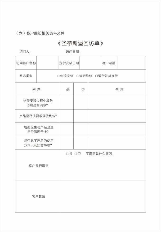 告別之前:告知客戶圣蒂斯堡全國免費(fèi)服務(wù)電話(售后服務(wù)貼)以及保修方式,請客戶在《產(chǎn)品配送單》上簽名,并填寫《配送滿意度調(diào)查表》后,合影留念。