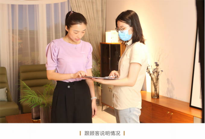 耐心解答客戶提出的關(guān)于家具保養(yǎng)的提問,同時(shí)將圣蒂斯堡產(chǎn)品使用說明書送給客戶,爾后教客戶如何掃描產(chǎn)品二維碼進(jìn)行防偽鑒定,請顧客對貨物進(jìn)行驗(yàn)收檢查,然后正式簽收《產(chǎn)品配送單》。