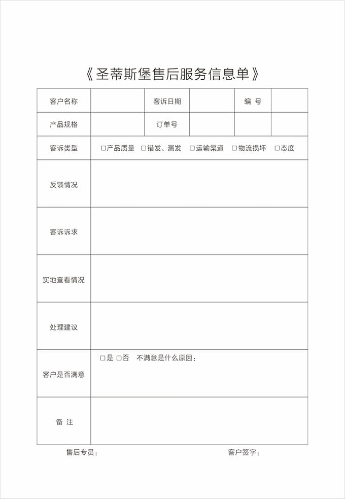 現(xiàn)場修復(fù)完成后,請客戶確認(rèn),在《圣蒂斯堡售后服務(wù)信息單》上簽字;不能現(xiàn)場修復(fù)時(shí)則必須跟客戶說明清楚,征得客戶同意后將產(chǎn)品帶回處理或返廠處理,應(yīng)開具相關(guān)收據(jù)交予顧客,并且登記備案;修理完畢后按照配送流程送到顧客家后應(yīng)向顧客索回收據(jù),并且請顧客在《圣蒂斯堡售后服務(wù)信息單》簽字。