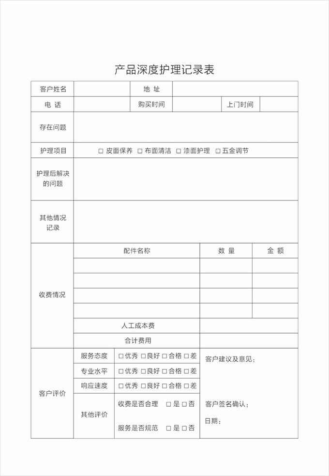 按要求認(rèn)真填寫服務(wù)記錄單據(jù)并請顧客填寫相應(yīng)內(nèi)容及簽字,離開顧客處時(shí)除了與顧客本人告別外,還需要向有關(guān)負(fù)責(zé)人打招呼,詢問是否還有其他問題,當(dāng)?shù)玫筋櫩偷臐M意允許后,方可離開。