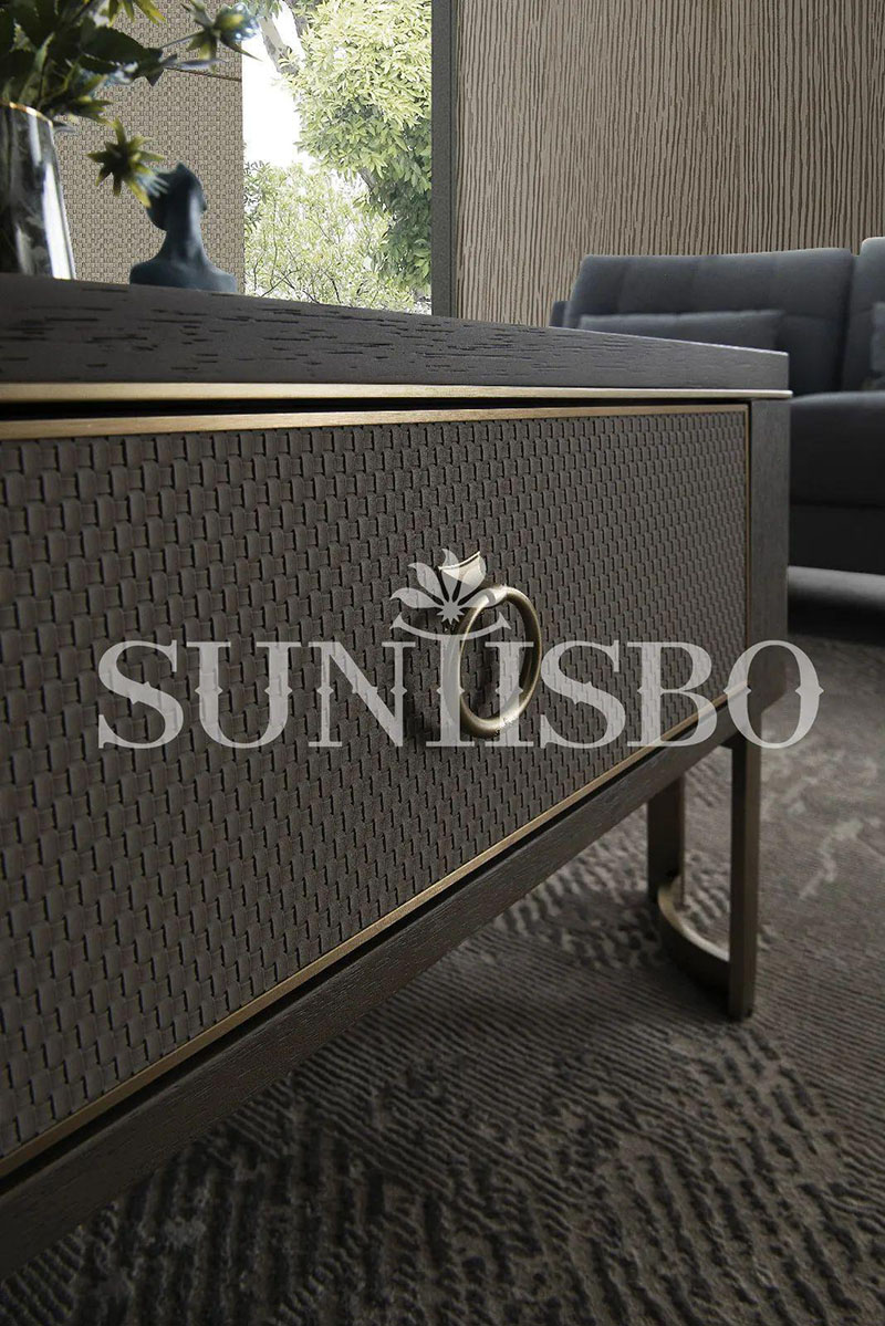 面板鑲嵌的編織紋皮質(zhì)在實木的基礎(chǔ)上進行雕刻,輔以極佳的傳統(tǒng)編織藝術(shù),讓空間倍顯溫潤時尚感。