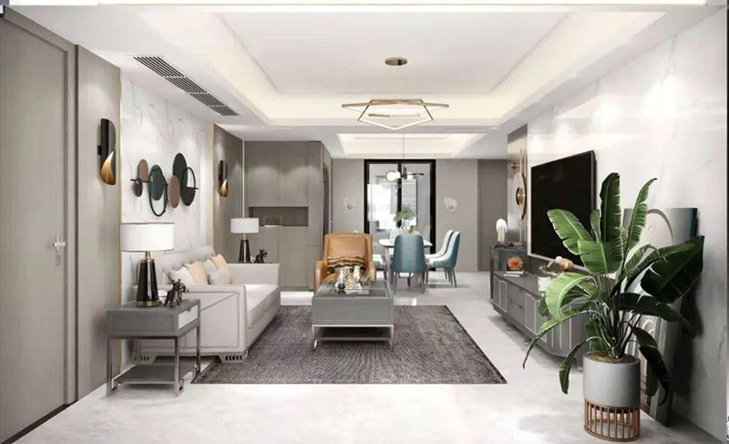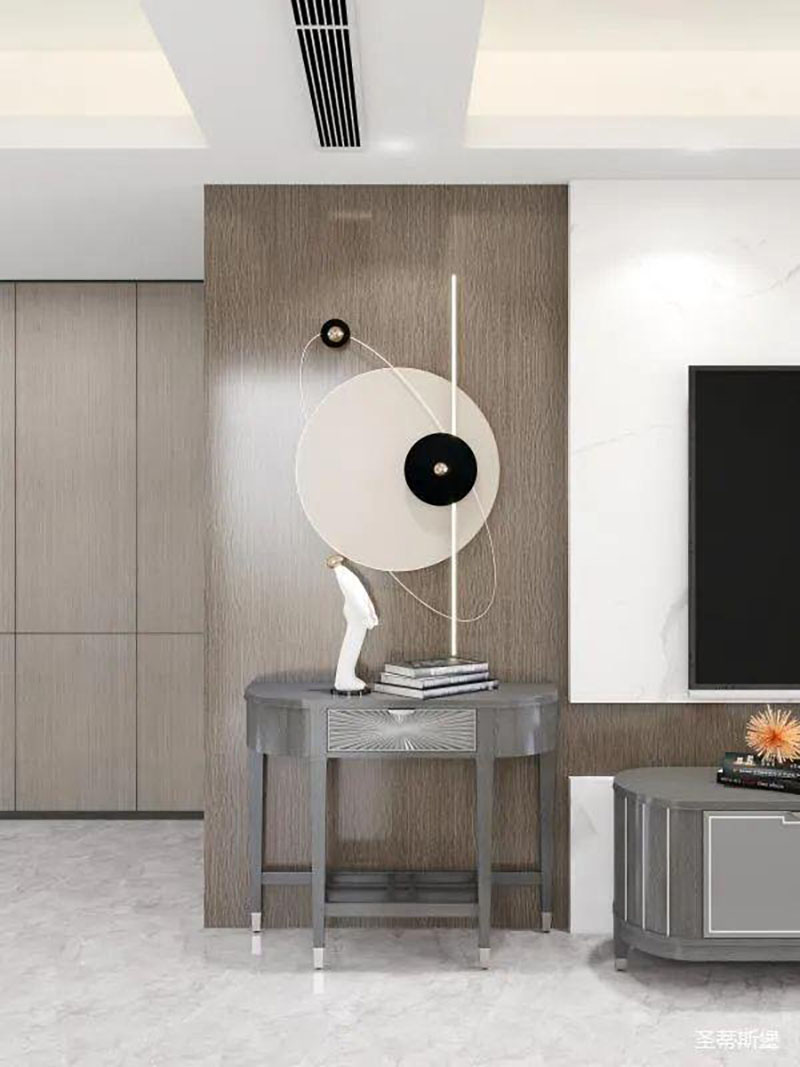 ▲設(shè)計師巧妙的運(yùn)用填充藝術(shù),將客廳電視與沙發(fā)背景色彩相呼應(yīng),利用凹凸互補(bǔ)的設(shè)計手法,傳遞著空間時尚。莫蘭迪實木家具,配以同色系的高級金屬底座,將精致輕奢從細(xì)節(jié)中脫穎而出。