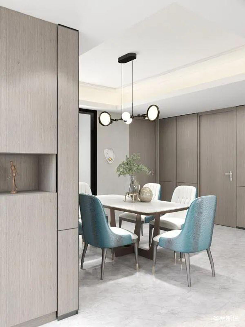▲澄亮湖藍(lán)的餐桌椅,一定是空間的點睛之處,溫柔跳脫的色彩,賦予了生活多姿多彩的體驗。經(jīng)典黑的簡約燈飾,在不忘溫馨氛圍的同時,也引領(lǐng)著造型界的時尚潮流。