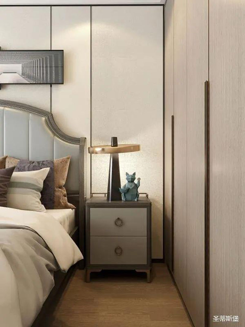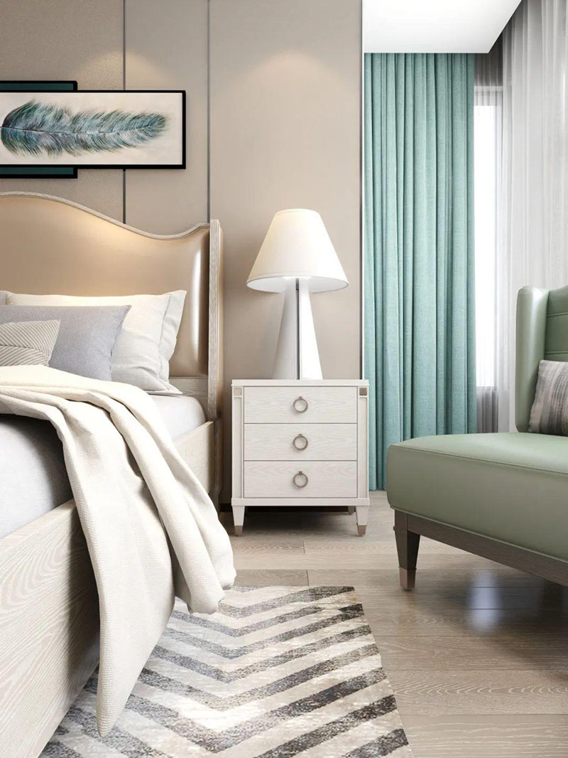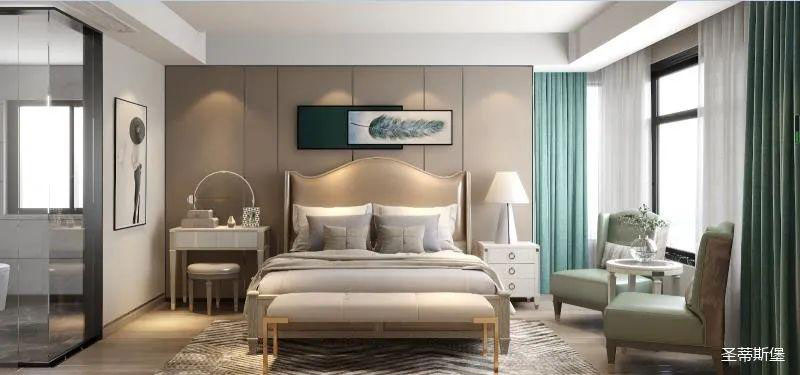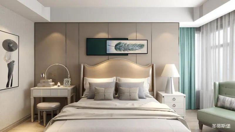 ▲次臥空間主要是以淺色為底調(diào),大面積的莫蘭迪色與淺色相平衡。極強(qiáng)線性裝飾畫帶來的延伸感讓視覺煥然一新。少許的金屬元素攝入,瞬間提升了空間的精致度,將溫潤雅致與時尚輕奢糅合在同一空間里,每一處都洋溢著浪漫的氣息。