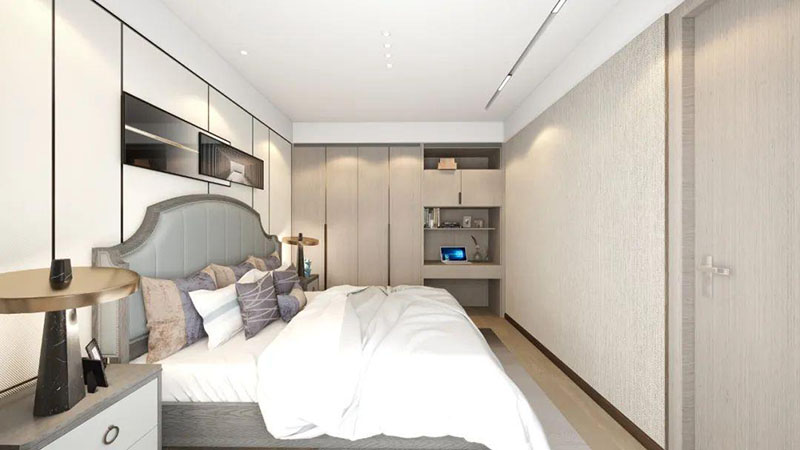 ▲主臥的棕色護(hù)墻板與白色家具,形成拼接體系,同色系相互對應(yīng),結(jié)合溫柔的軟裝搭配,使整個臥室都沉浸在溫馨柔和的氛圍內(nèi)。
