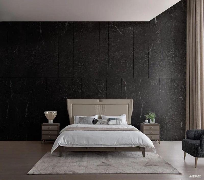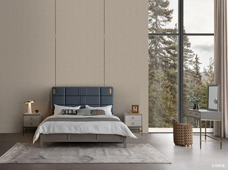 次臥床頭背景沿用了暗色大理石護(hù)墻,空間層次分明,簡(jiǎn)約時(shí)尚的米色床屏糅合金屬鑲嵌與真皮編織藝術(shù),看似舒適隨意,卻在極簡(jiǎn)中透著淡淡的奢華感。大面積的落地窗讓自然光傾入室內(nèi),拉上與床屏同色系的窗簾,令次臥的室內(nèi)空間明暗有度。