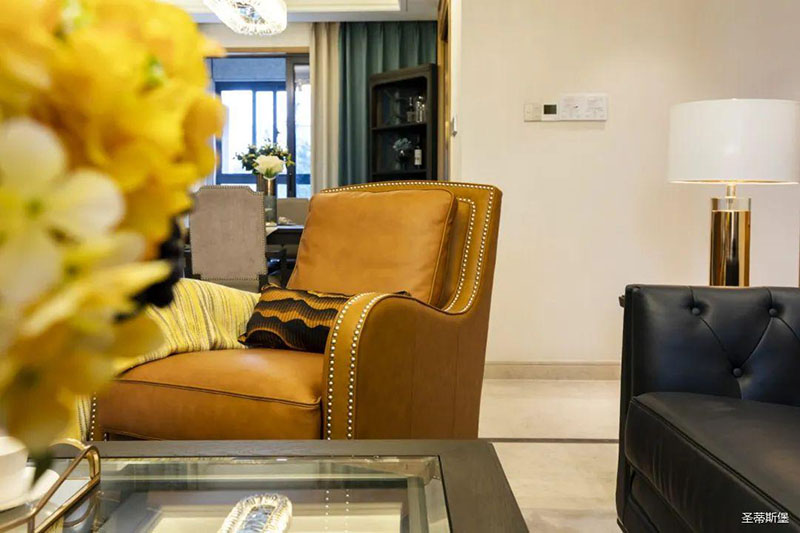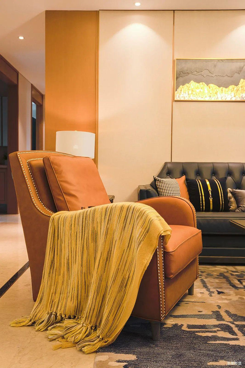 愛馬仕橙的休閑椅是空間的點(diǎn)睛之筆,相對于霸氣沉穩(wěn)的墨綠雙人沙發(fā),它更為時(shí)尚摩登,兩者合理搭配,賦予了空間陽剛與柔情并存的意境。