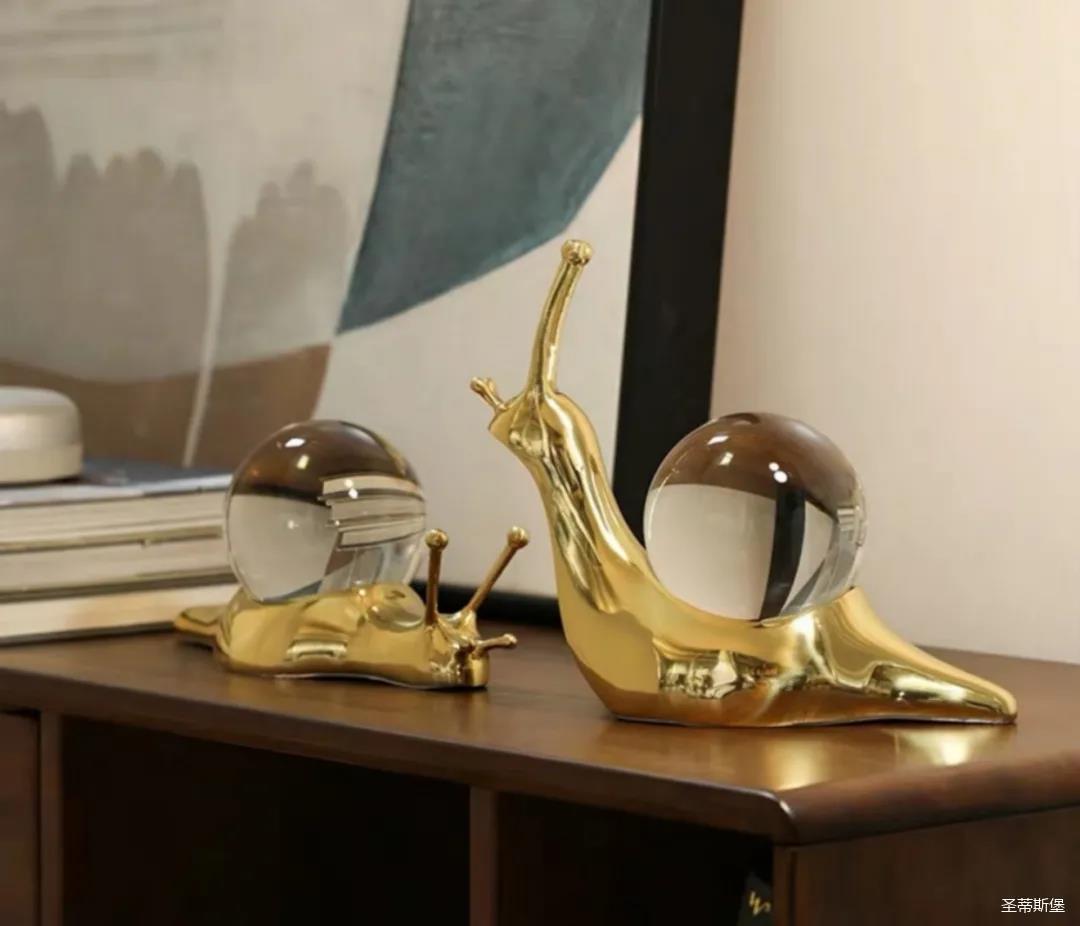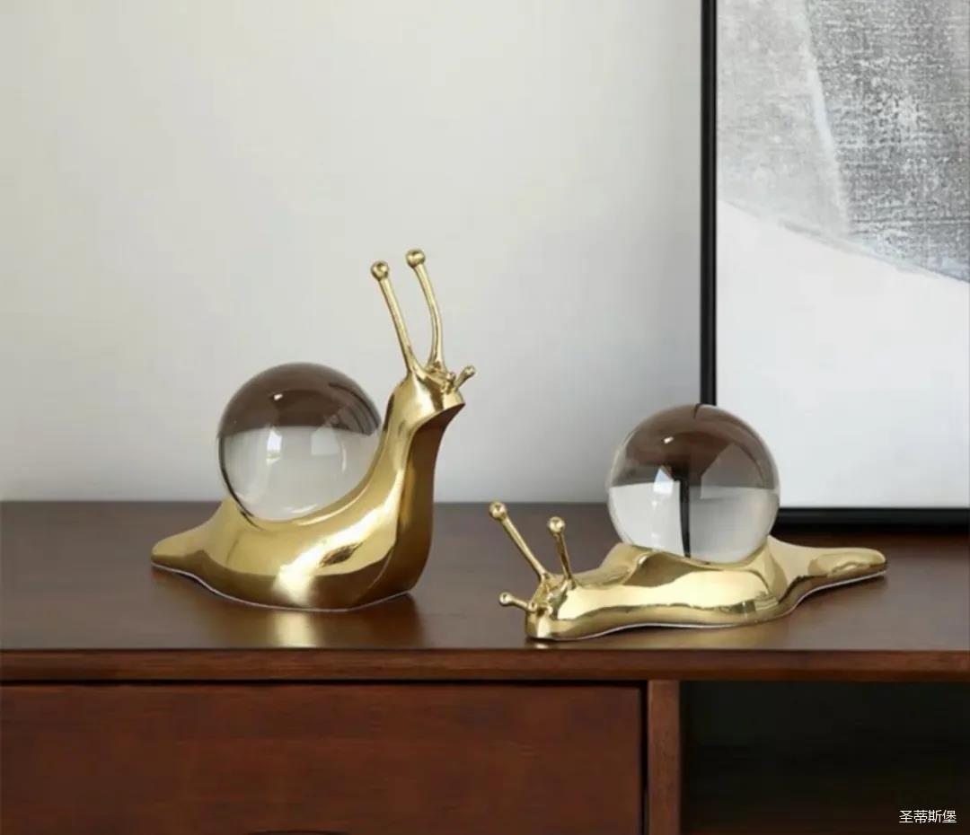 在黃銅材質(zhì)上勾勒出蝸牛流暢的肌肉線(xiàn)條,描摹蝸牛攀爬蠕動(dòng)與站立眺望的姿態(tài),加上觸須伸縮,豐富而逼真的細(xì)節(jié)制作,生動(dòng)有趣。