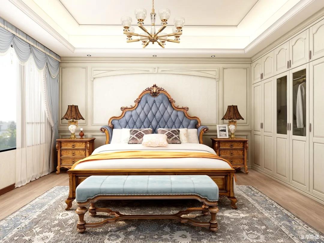 03主臥主臥設(shè)計運用現(xiàn)代的設(shè)計手法和材質(zhì)還原了古典氣質(zhì),以干練的線條傳達(dá)著溫馨的臥房。蜿蜒的波紋曲線,細(xì)膩精致的雕花,猶如隨風(fēng)起伏的浪花,在清澈藍(lán)的床屏上跳躍,向靜態(tài)空間展示著活躍的動態(tài)效果。曲直線條完美融合,打造一個靈動而又精致的生活空間。