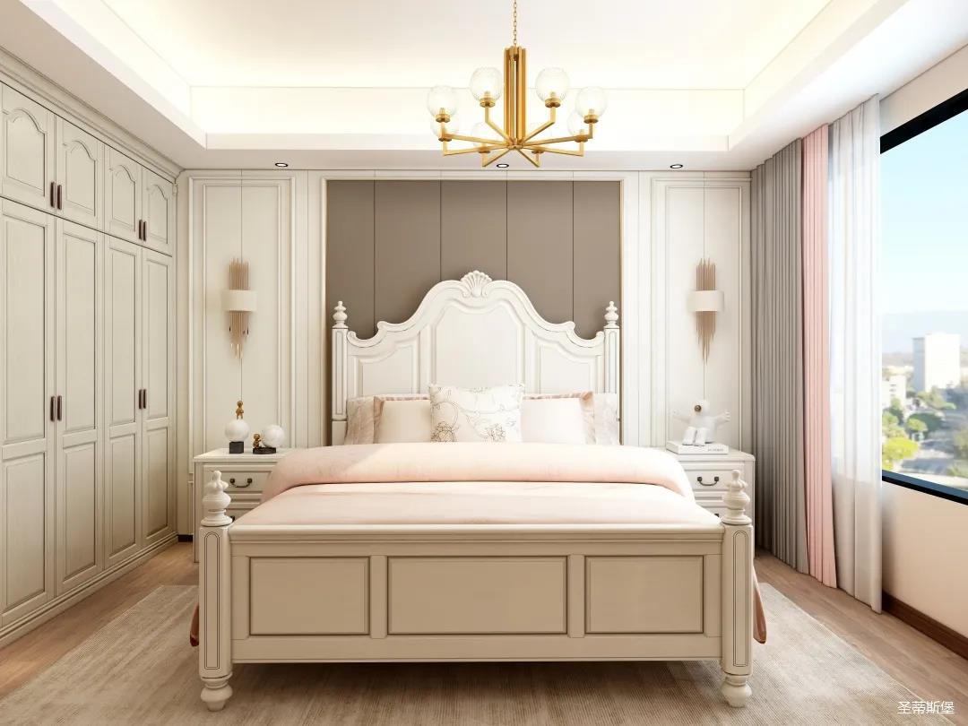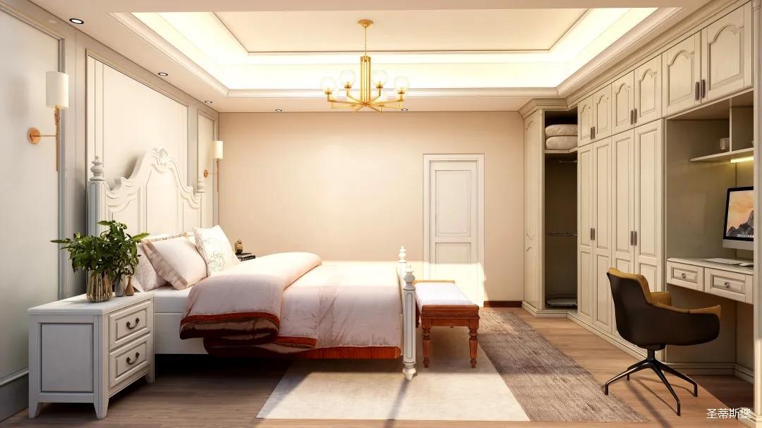 次臥的設(shè)計更注重收納,人性化嵌入式書桌,整排衣柜設(shè)計有效的利用了空間每一個角落。床屏在保持原有美式家具特色的同時,增加了線條美,將繁雜的雕琢簡化,并融入時尚的美式元素,壁燈,吊燈糅合自然光影,完美呈現(xiàn)出尊貴的空間格調(diào)。