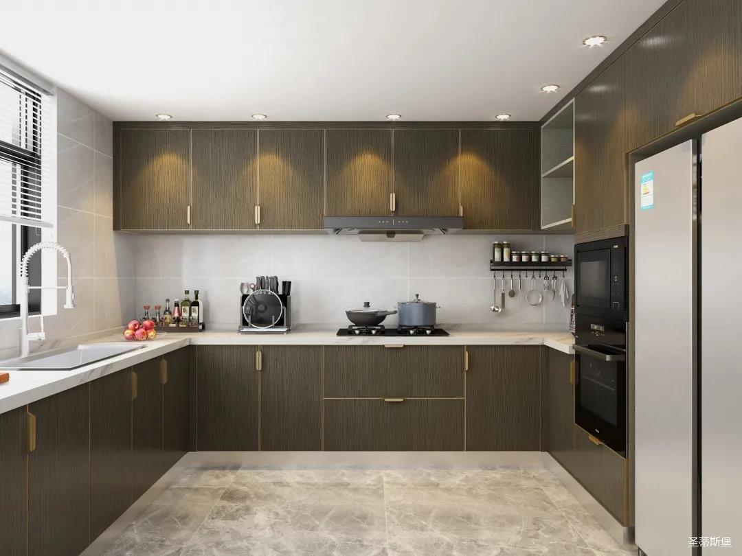 u型空間格局,設(shè)計(jì)師將功能區(qū)合理劃分,讓洗切煮一氣呵成。以米白水磨石+英倫爵士灰實(shí)木為主導(dǎo)的櫥柜系統(tǒng)中,人體工學(xué)流線,讓每一細(xì)節(jié)都折射出屋主對(duì)生活的考究,一廚一柜,每一處都關(guān)乎著我們對(duì)生活的熱忱。