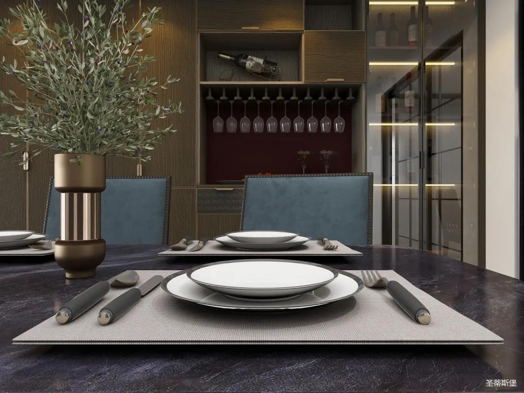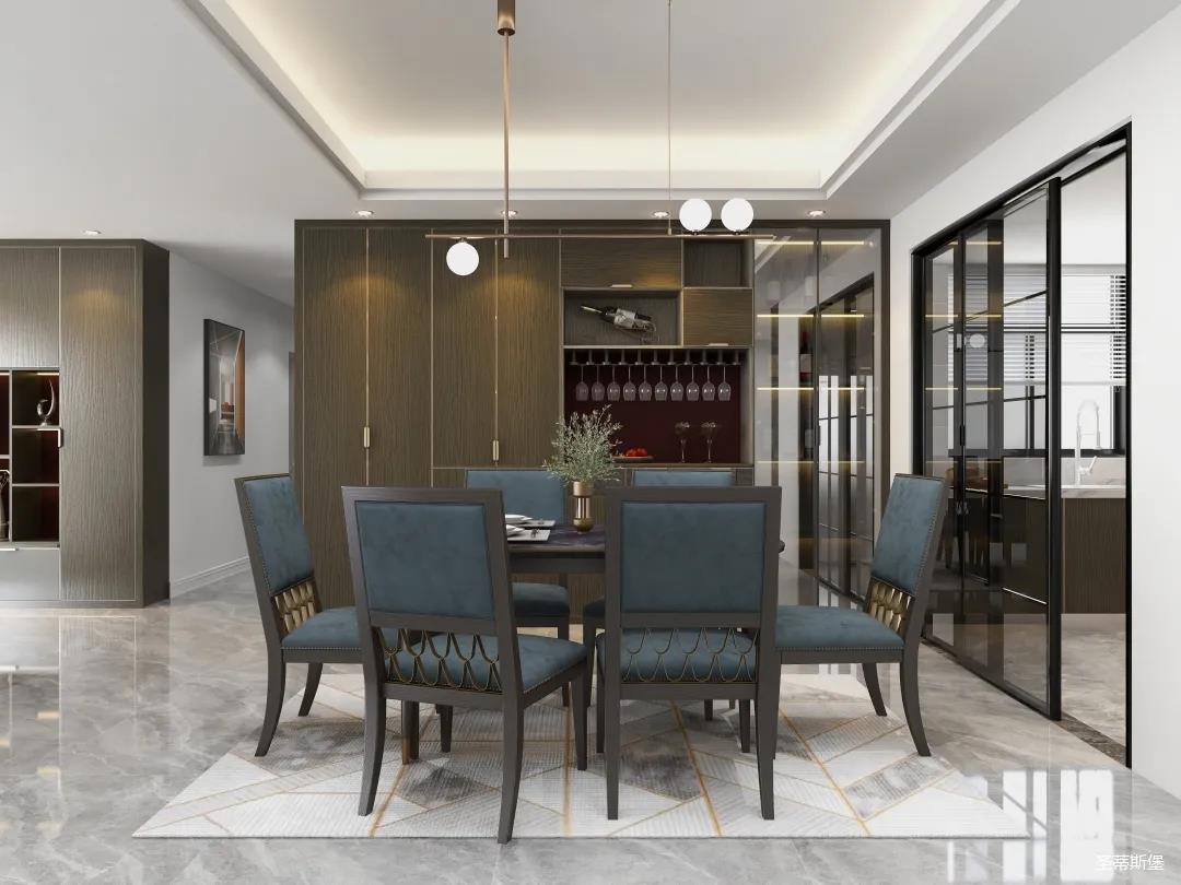 餐廳系統(tǒng)詮釋著材質(zhì)與工藝的質(zhì)感結(jié)合。一字型定制餐邊柜,實(shí)木飾面細(xì)膩?zhàn)匀唬尵筒涂臻g成為了高級(jí)情調(diào)的重點(diǎn)。明暗分區(qū)的設(shè)計(jì)構(gòu)造,順勢(shì)創(chuàng)造了更多的儲(chǔ)物驚喜。