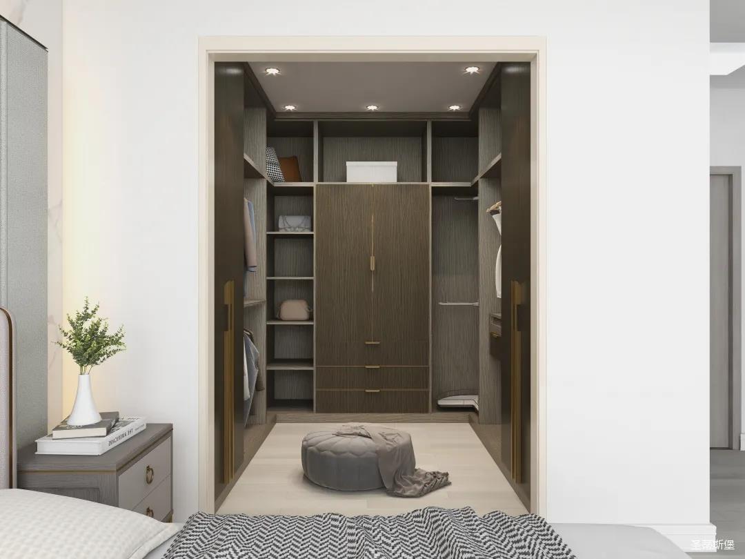 衣帽間進(jìn)行u型設(shè)計(jì),全落地定制形式,融匯了簡奢風(fēng)格獨(dú)具的浪漫與優(yōu)雅。金屬、實(shí)木拼接細(xì)節(jié)與天然材質(zhì)為衣帽間注入與眾不同的高級(jí)氣質(zhì)!開放式的懶人布局,讓衣物收納一目了然,能同時(shí)滿足疊放與掛衣功能,實(shí)現(xiàn)了“一柜多用”。