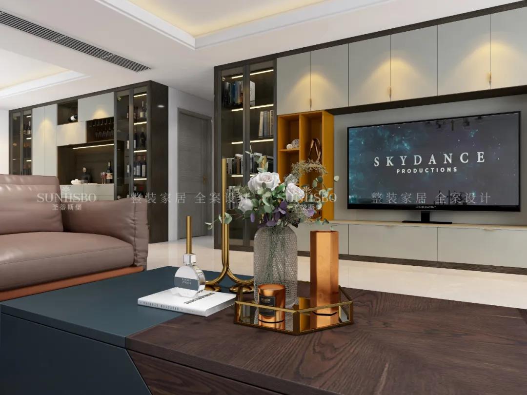 客廳一面置頂?shù)亩ㄖ乒?,大大增加了空間收納,也將電視背景墻的觀賞性發(fā)揮到極致。淺灰與明亮橙的“動(dòng)靜”屬性,與沙發(fā)上的愛馬仕橙相呼應(yīng),從空間中漫溢出歡樂和跳動(dòng)的樂章,回響生活中那一抹絢麗和精致,同時(shí)也擁有著對(duì)立且和諧的高級(jí)范兒。