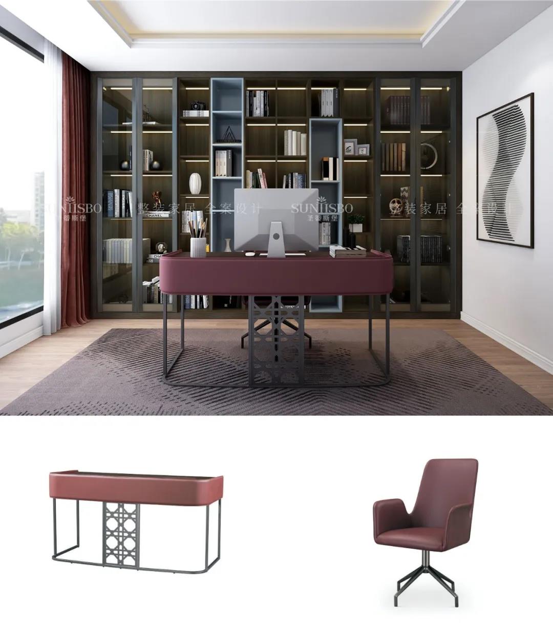 書房用定制柜解決了一面墻的設(shè)計(jì),沒有夸張的色彩裝飾,簡(jiǎn)潔的柜體與墻面搭配起來顯得十分精致整潔,透明的可視區(qū)域從視覺上擴(kuò)大了空間感。閑暇時(shí)光,拾一本書,于書房,將生活與工作區(qū)分開來。
