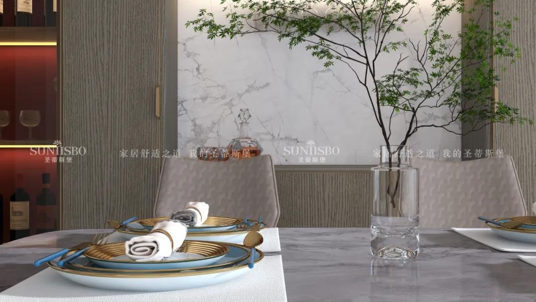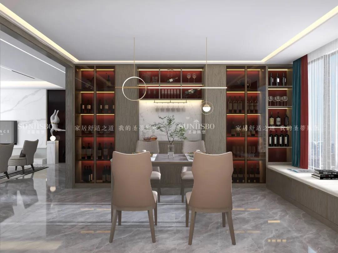 簡(jiǎn)奢餐桌與玻璃大立柜,將空間簡(jiǎn)化,帶來(lái)了純粹的空間視覺(jué)效果。金色鑲邊的點(diǎn)綴,為這份純粹增添了奢華質(zhì)感。極簡(jiǎn)玻璃定制柜體,拉開(kāi)了大空間的開(kāi)闊視野,光影交匯間,硬朗的氣質(zhì)與柔和的自然光產(chǎn)生了趣味的互動(dòng),為空間提供了更具藝術(shù)張力的奢享用餐體驗(yàn)。