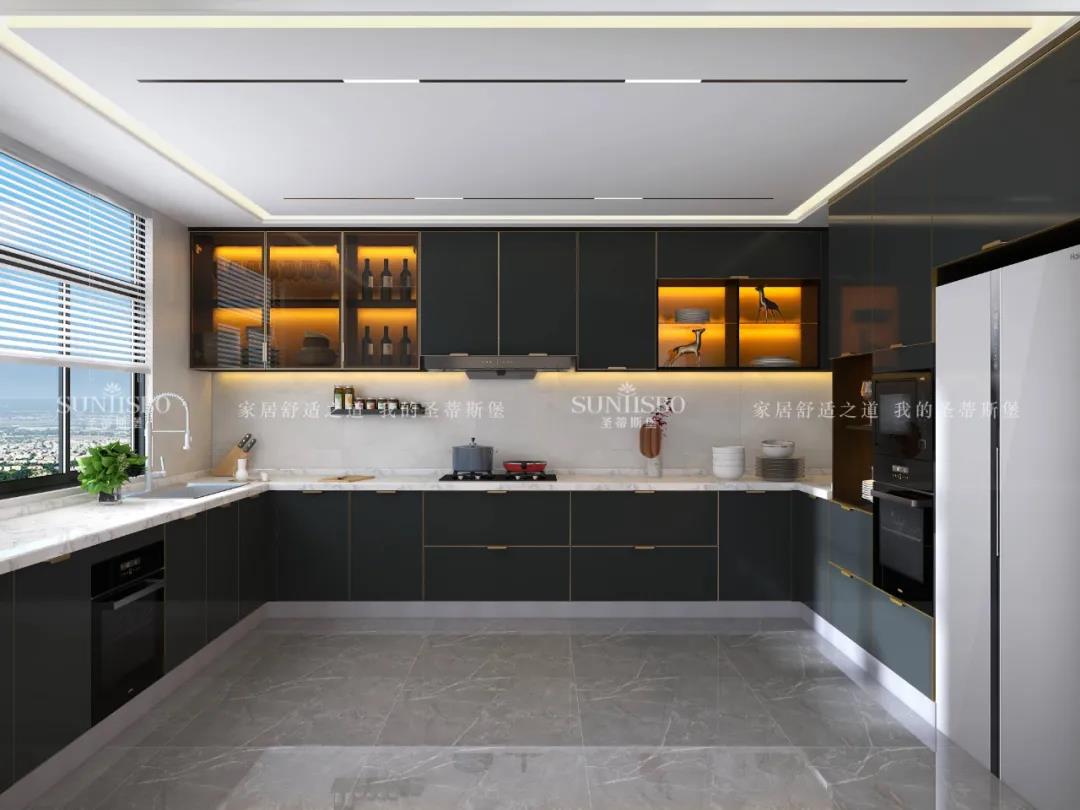 視覺(jué)色彩是激活感官的情緒支點(diǎn),以色彩為重心的櫥柜系統(tǒng),喚醒了簡(jiǎn)奢廚房的關(guān)鍵所在。亮色金屬與深色實(shí)木柜體形成撞色櫥柜,極具空間爆發(fā)力。在深色柜體包裹中展現(xiàn)金屬、玻璃、實(shí)木的高級(jí)質(zhì)感,剛毅線條交錯(cuò)延續(xù),一秒就點(diǎn)燃了時(shí)尚潮流的生活態(tài)度。