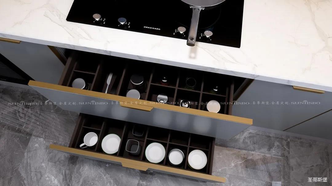 廚房是獨屬我的一片小天地,設(shè)計師充分利用了材質(zhì)特性,定制高柜,根據(jù)我的用廚習(xí)慣進行收納區(qū)域劃分,極簡大氣的外部結(jié)構(gòu)實則蘊藏著超乎想象的大收納空間。