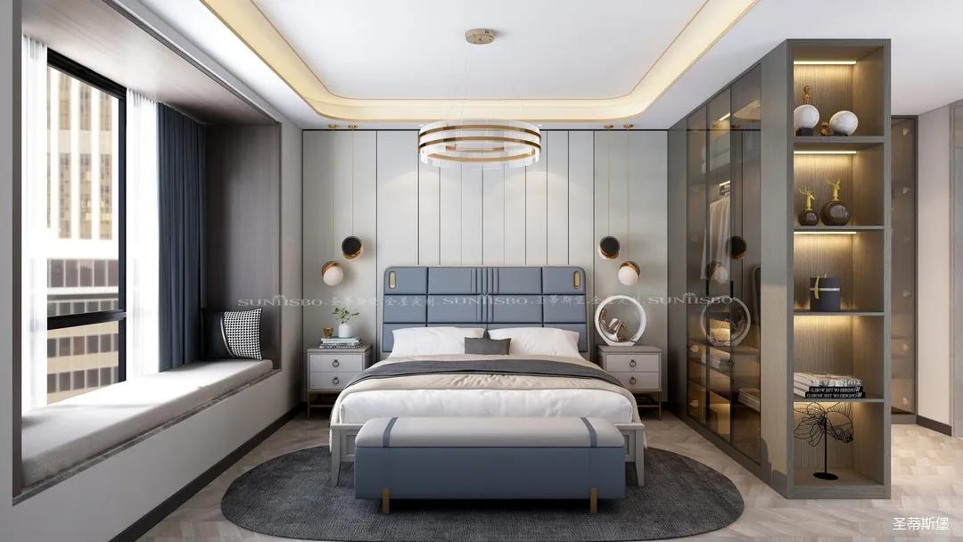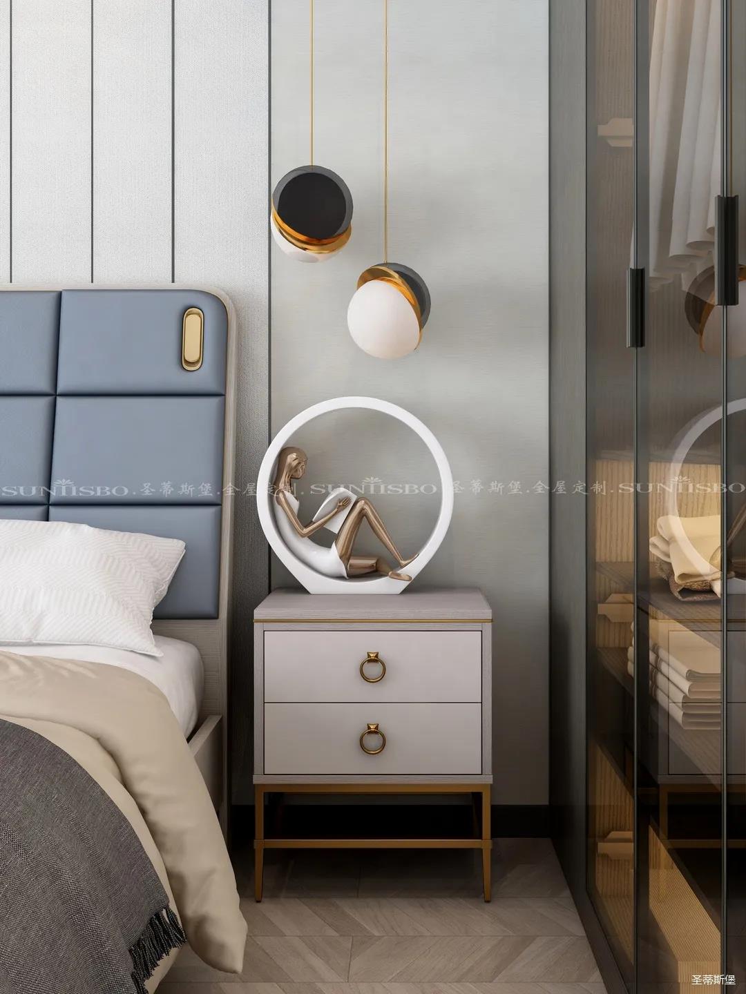 臥室的設(shè)計繼續(xù)延續(xù)著空間的高級灰,藍(lán)灰色彩的對比,讓主臥空間層次感更加豐富,充足的陽光隨意散落,空間更加溫暖大氣,對稱的球形吊燈設(shè)計,恍如兩個“快樂星球”,展現(xiàn)著空間應(yīng)有的藝術(shù)性,設(shè)計師巧妙地設(shè)計,營造出與眾不同的生活品質(zhì)。