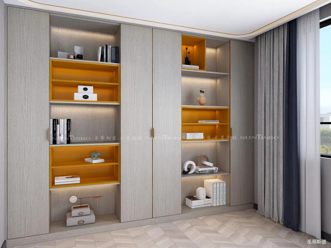 書柜點綴著適當(dāng)?shù)膼垴R仕橙,除了自身攜帶的高貴氣質(zhì),在聚焦視線的同時,還明確了收納分區(qū)。