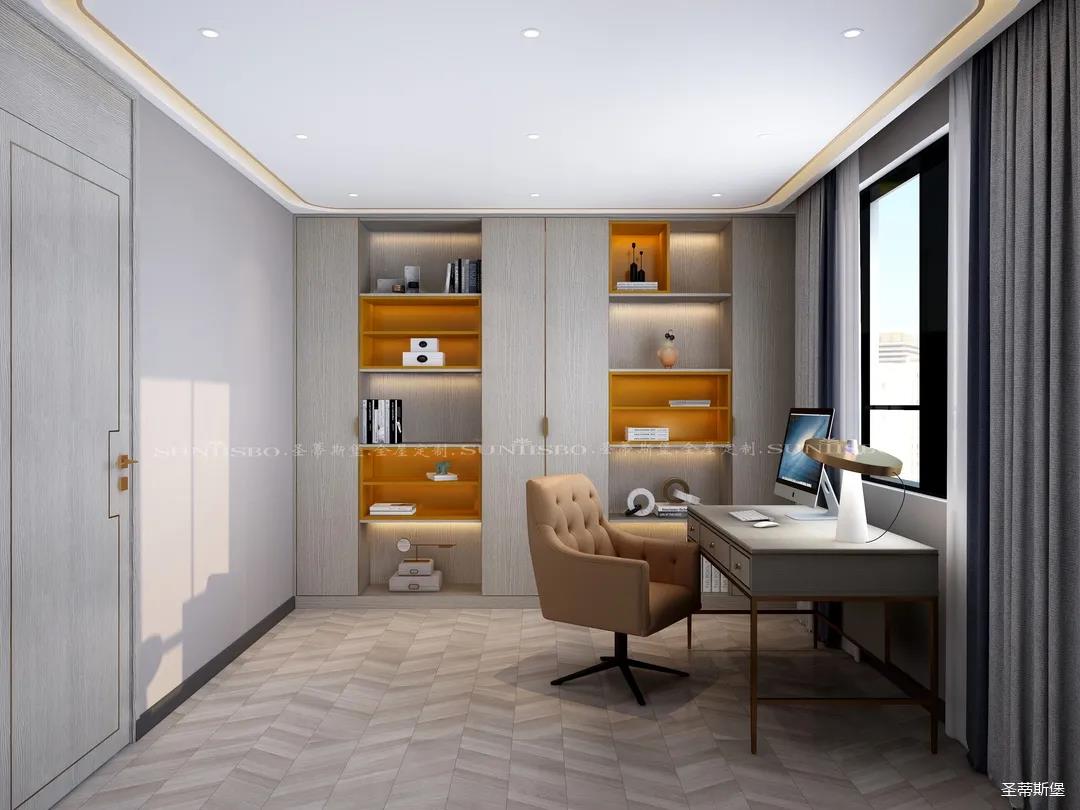 英倫仿古灰實木嵌墻書柜,結(jié)合同色系的時尚簡約書桌,整個空間都被自然氣息包圍。由于工作原因,加班也成為了生活中的常態(tài),簡約書房設(shè)計打破了平時忙碌的生活,也為心中尋得那一方心靜之地。