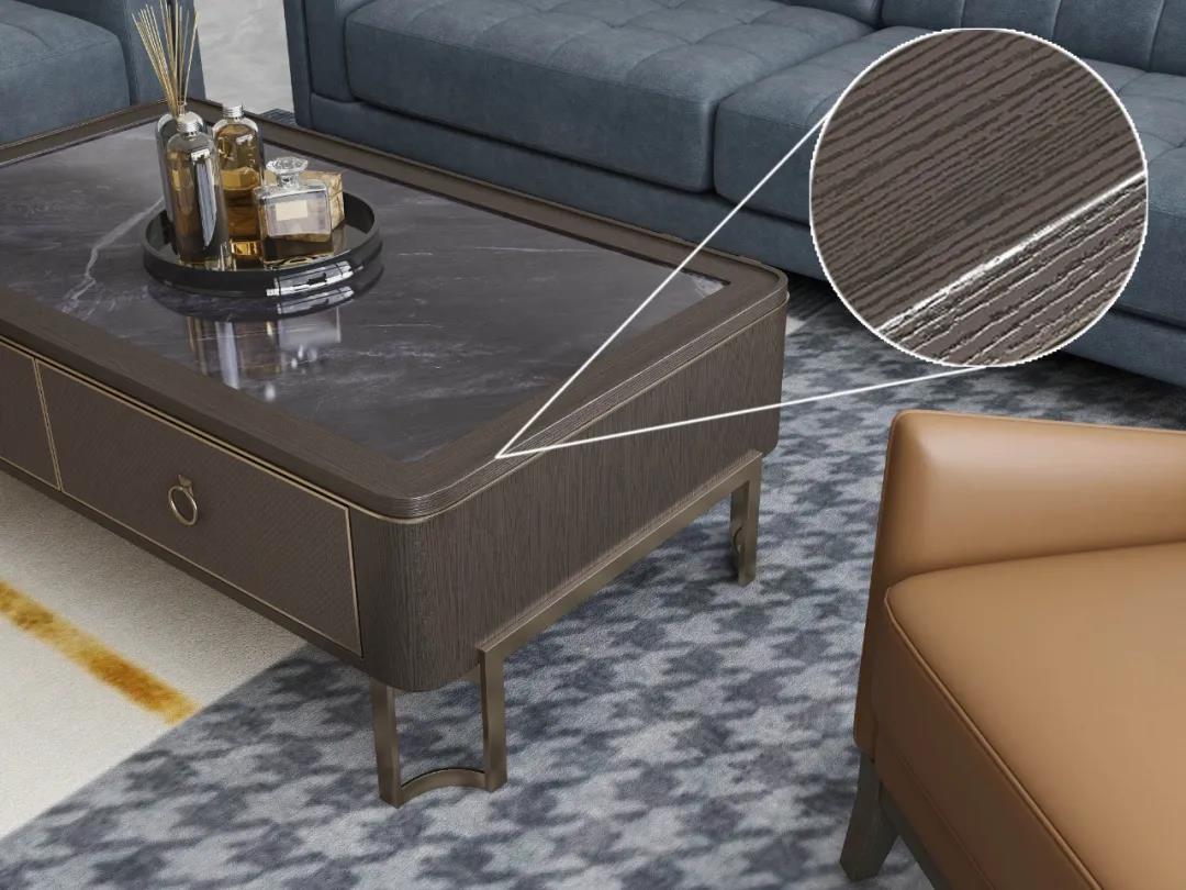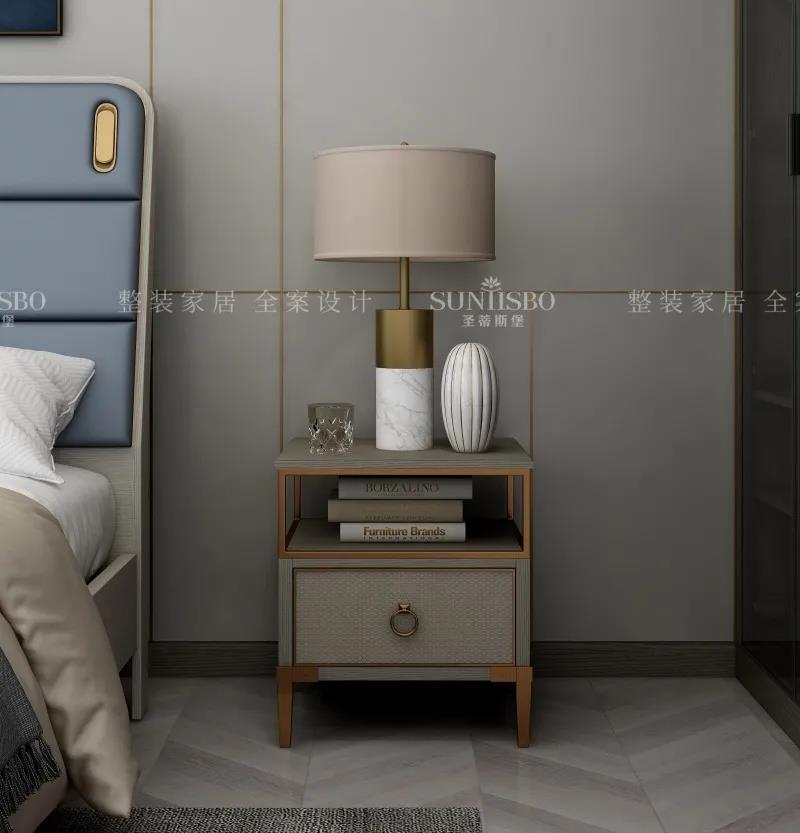 洛斯系列在現(xiàn)代時尚的基礎(chǔ)上還增加了許多輕奢的金屬元素,金屬元素在輕奢風里毋庸置疑的存在。為什么人喜歡戴耳環(huán)、戒指、項鏈等首飾?為什么衣服、鞋子、包包上都能看到金屬元素的身影?從時尚圈到家居界,金屬元素憑借其獨特的質(zhì)感以及由內(nèi)散發(fā)的高級氣質(zhì),有著強大的包容性,提升風格格調(diào),增添時尚氣息。運用在家居中可成為整個空間的亮點,成為時下家居裝修的潮流趨勢,深受大家的喜愛。但是目前市面上采用金屬鑲嵌工藝的多數(shù)是在板木結(jié)合的基礎(chǔ)上,難度相對簡單易操作。在洛斯系列里,是在實木的基礎(chǔ)上進行金屬鑲嵌工藝,要求精準度非常高,誤差不得超過0.5毫米,不然就會對不齊。在洛斯系列中,桌子的四角與腿部、柜類門板,沙發(fā)腿部,茶幾支架,餐桌臺面,床品外框等都將金屬恰到好處地融入到空間的每個角落,讓空間擁有輕奢的高級感,提升空間的質(zhì)感。將優(yōu)雅謙遜的都市精致感全面呈現(xiàn),讓裝修冷中帶暖、沉靜精致,也向人們展示了一種精致的生活方式,更為整個家注入靈動氣息。