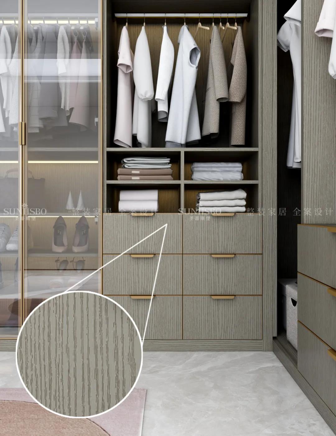 當下人對原生態(tài)材質(zhì)的極致追求也是當下人回歸自然的一個方式,現(xiàn)在很多高端的精裝房墻上都是木飾面,這些木飾面都是貼木皮或者帶木紋的產(chǎn)品,洛斯系列采用紅橡直紋的實木壓紋工藝,使木紋呈現(xiàn)河流的波紋狀,第一可以保持很好的原木的質(zhì)感的同時,也能夠給空間帶來一種靈動感,不會顯得呆板與單調(diào)。由于木面的半開放式涂裝,表面凹凸不平,深淺有致的設(shè)計,使產(chǎn)品在燈光下產(chǎn)生漫反射的光線折射,降低了整體產(chǎn)品和空間上的高光感,使人在心理上有更加柔和感受,更加有生活的氣息,就像亞麻質(zhì)感的面料會讓更多的人接受;與市面上大部分輕奢的鋼琴烤漆相比,鋼琴烤漆的表面是平整光滑的,因此在光線下呈鏡面反射,雖然看起來會有奢華的效果,但是如果放在家里則會給人帶來冰冷與距離感。