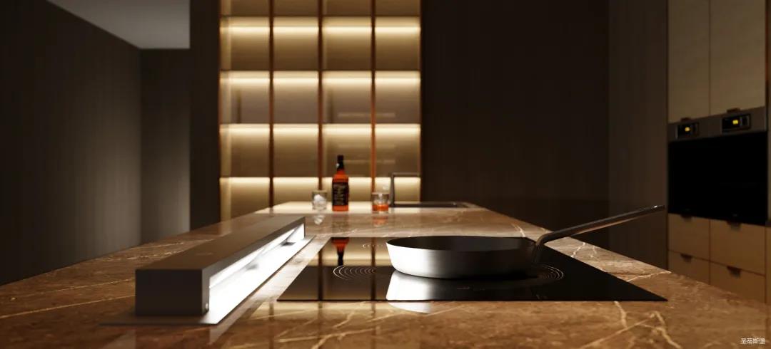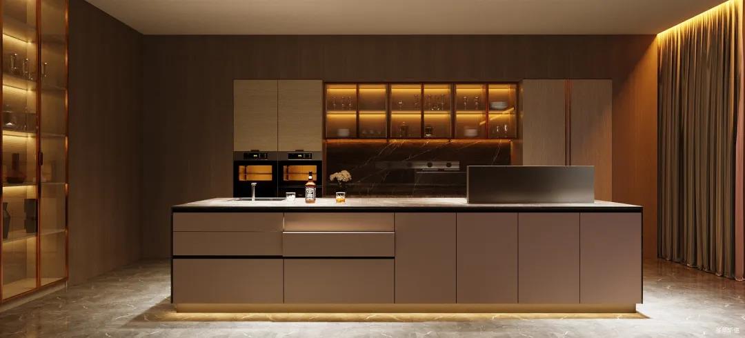 餐廚的極簡也可兼具多元,以一字內(nèi)嵌式展開的廚區(qū)收納柜,兼顧了從杯具、調(diào)料等廚用材料收納到廚電歸置動線功能處理。在展示區(qū)域,玻璃隔板組合實(shí)木定制柜的表現(xiàn)形式,更是提升了空間的明亮度與寬闊感。