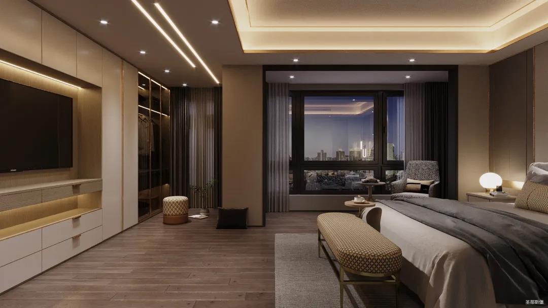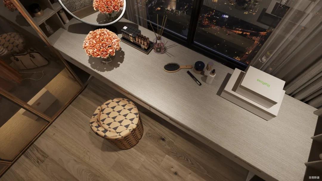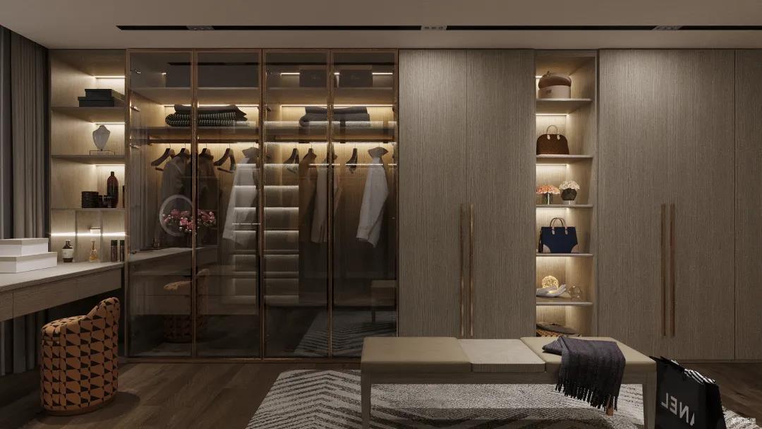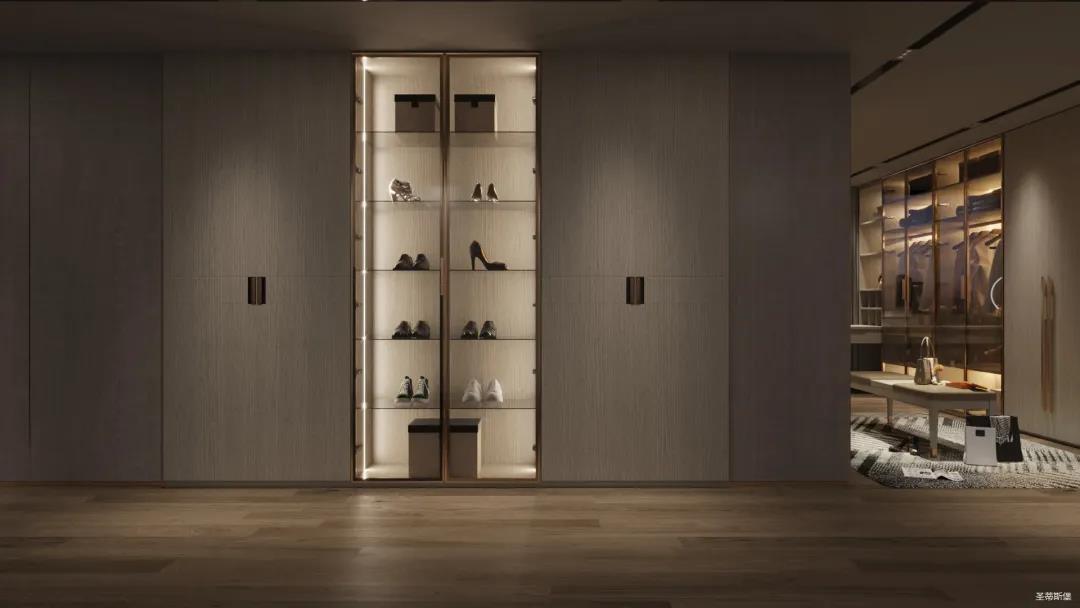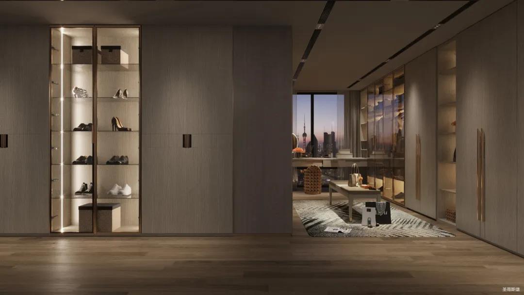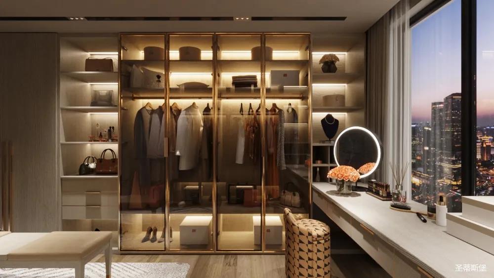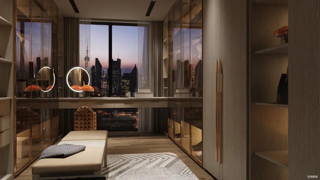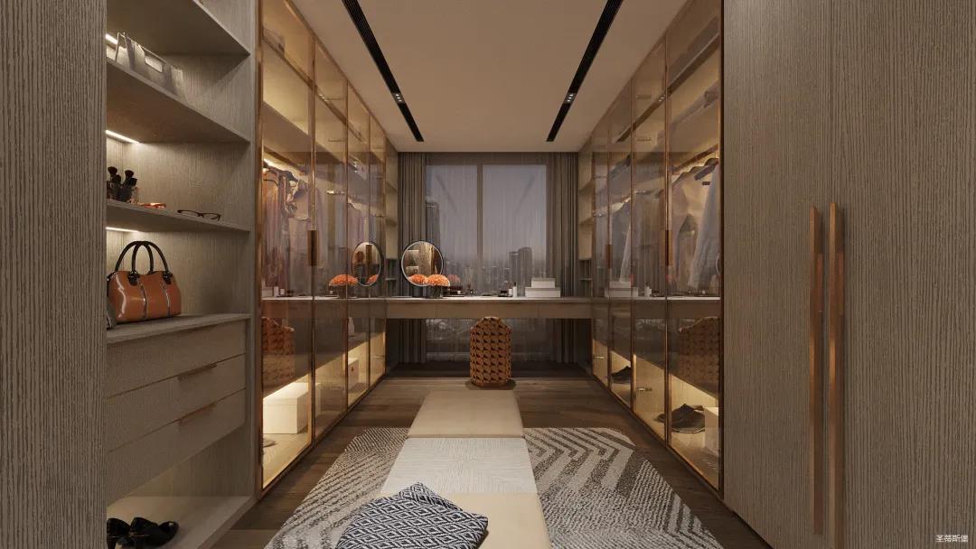 移步衣帽間,精簡華麗幾乎貫穿了整個空間,質(zhì)感高級的實(shí)木定制柜框架、通透明亮的玻璃展示區(qū)、色調(diào)醇厚的金屬鑲邊,每一項(xiàng)細(xì)節(jié)搭配都在強(qiáng)調(diào)著業(yè)主的高端品位。妝臺前的落地窗讓我們在觀賞都市繁華的同時也屏蔽了都市喧囂,讓我們置身于繁華都市中有一處寧靜休憩地。