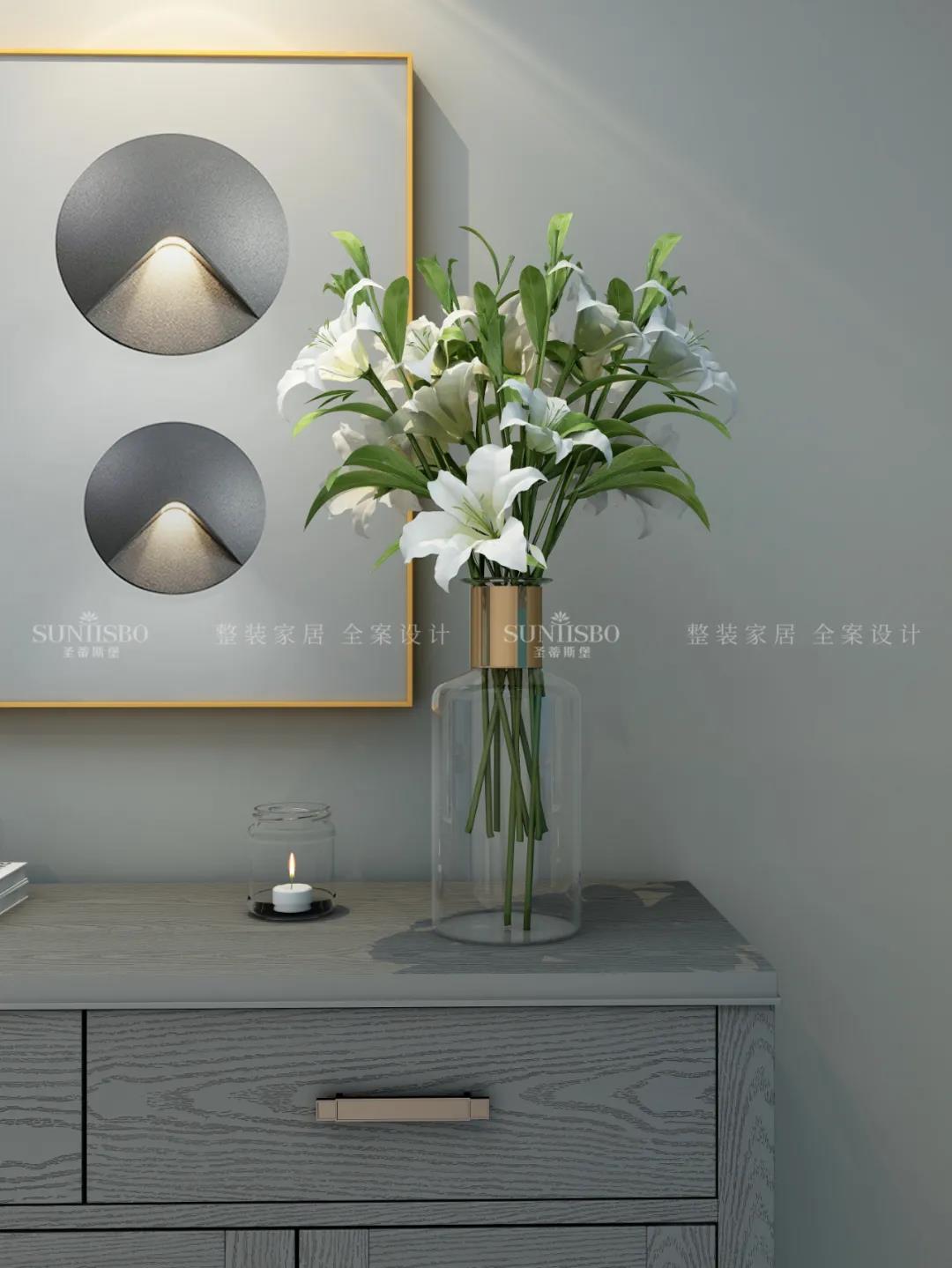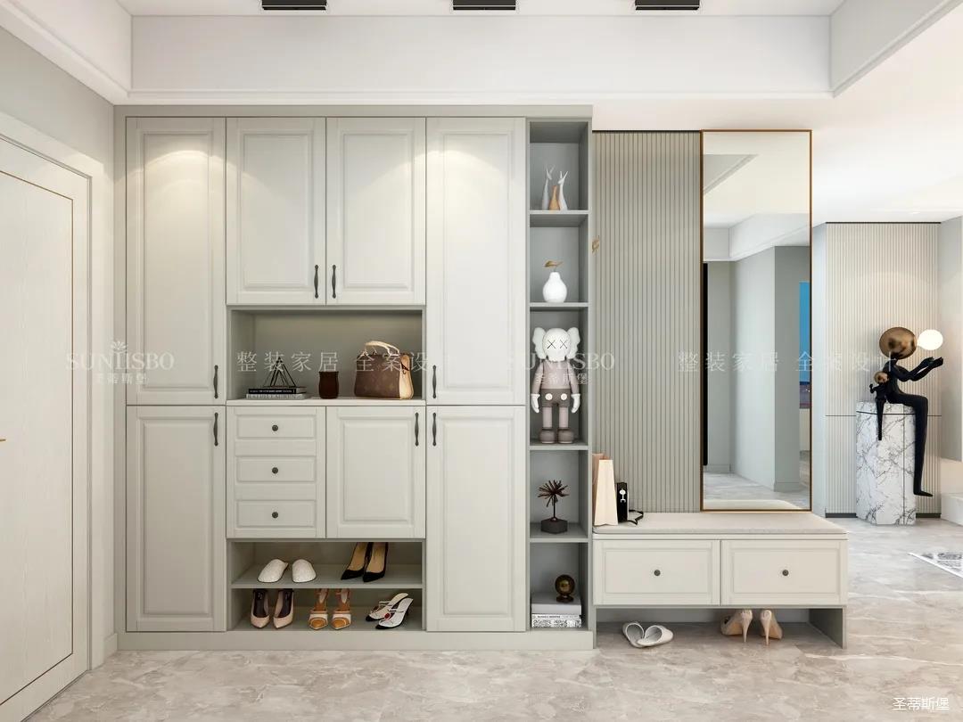 入戶側(cè)面設(shè)計一字型玄關(guān),腰部,底部留空做層板,便于隨手放置鑰匙、鞋包等物品,中間留空設(shè)計為開放展示區(qū),加上軟裝飾品點(diǎn)綴,達(dá)到業(yè)主對品質(zhì)生活追求的理想狀態(tài)。應(yīng)女主人要求,玄關(guān)還加長延伸出妝鏡和換鞋凳,讓動線自然流暢。