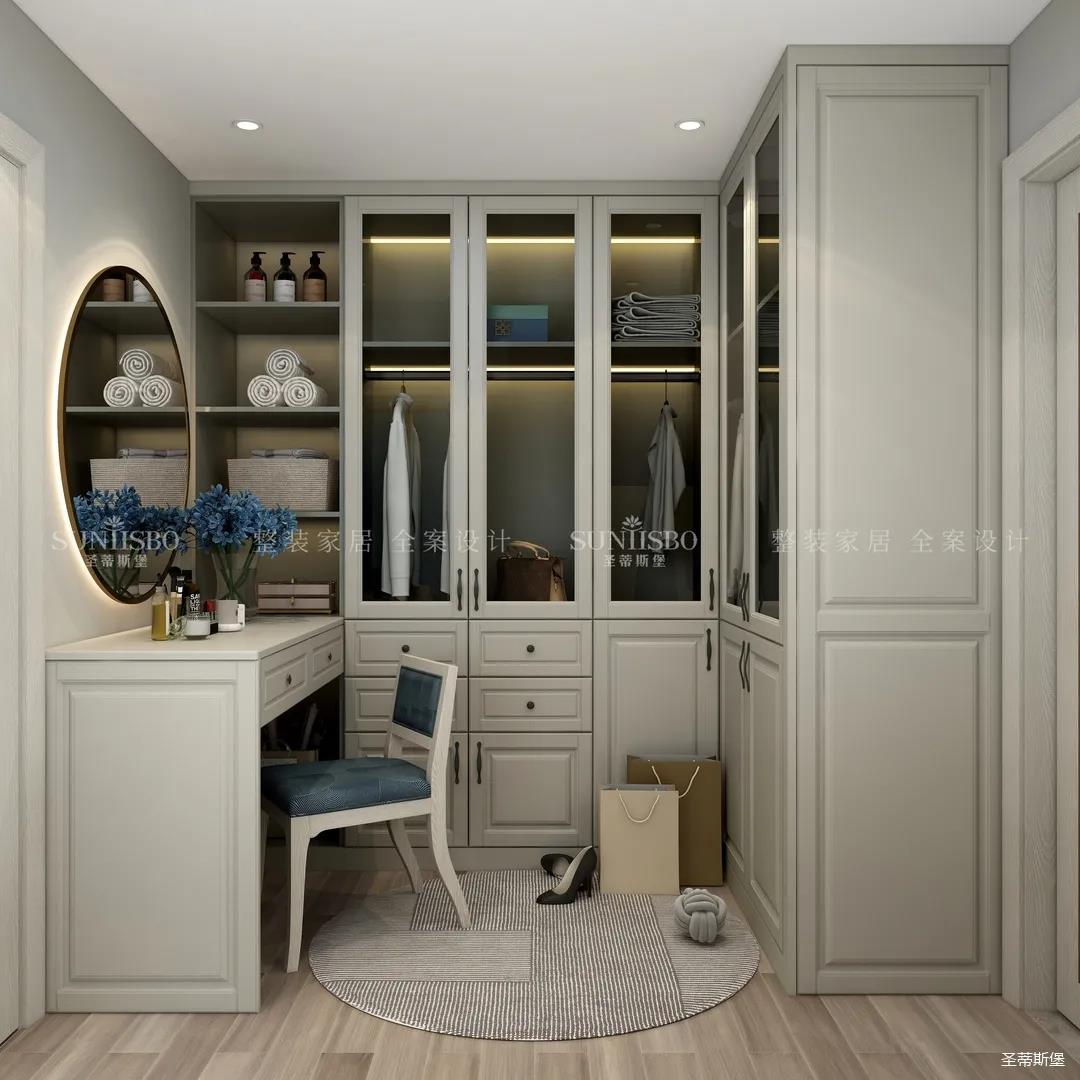 利用主臥多出來的小空間,設(shè)計打造出步入式衣帽間。定制了L型的轉(zhuǎn)角衣柜,提供了超強(qiáng)的收納空間。圓形的裝飾地毯與妝鏡相呼應(yīng),彰顯著空間女主人對精致生活的態(tài)度。