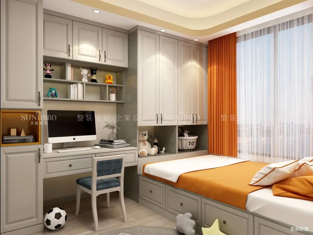 為給小朋友提供良好的居住環(huán)境,兒童房功能一應(yīng)俱全,兼具開放式與封閉收納,將兒童的學(xué)習(xí)區(qū)與休息區(qū)合理劃分,打造了一個良好的生活習(xí)性,仿古白的整體柜,巧妙的將明亮橙作為撞色,令空間充滿童趣與活力。