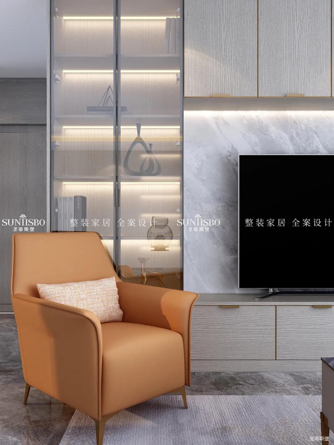 高級灰+活力橙,是百看不厭的經(jīng)典搭配,當(dāng)冷靜與熱情碰撞,為客廳奠定了時(shí)尚優(yōu)雅的基調(diào)。設(shè)計(jì)師以定制柜為原型,打造出兼具實(shí)用與裝飾功能為一體的電視背景墻,金屬包邊的柜體,在幾何燈光的照耀下散發(fā)出光澤,提升了整體空間的質(zhì)感,也撩動著我們的心弦。