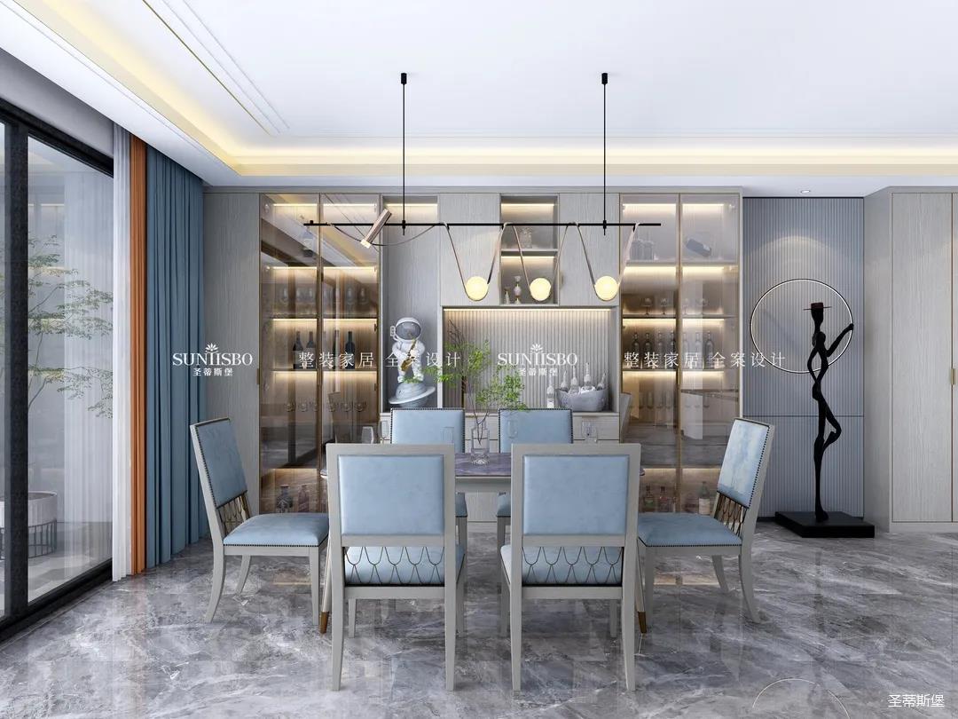 從優(yōu)雅中款款而來,高級灰與霧霾藍(lán)的冷靜色調(diào)勾勒出一個高貴而又摩登的用餐空間。設(shè)計(jì)師從玄關(guān)直入打造一排定制柜體,包含了玄關(guān)和餐邊柜,藝術(shù)燈形與時(shí)尚餐椅弧形相呼應(yīng),營造出溫暖柔和的用餐環(huán)境。