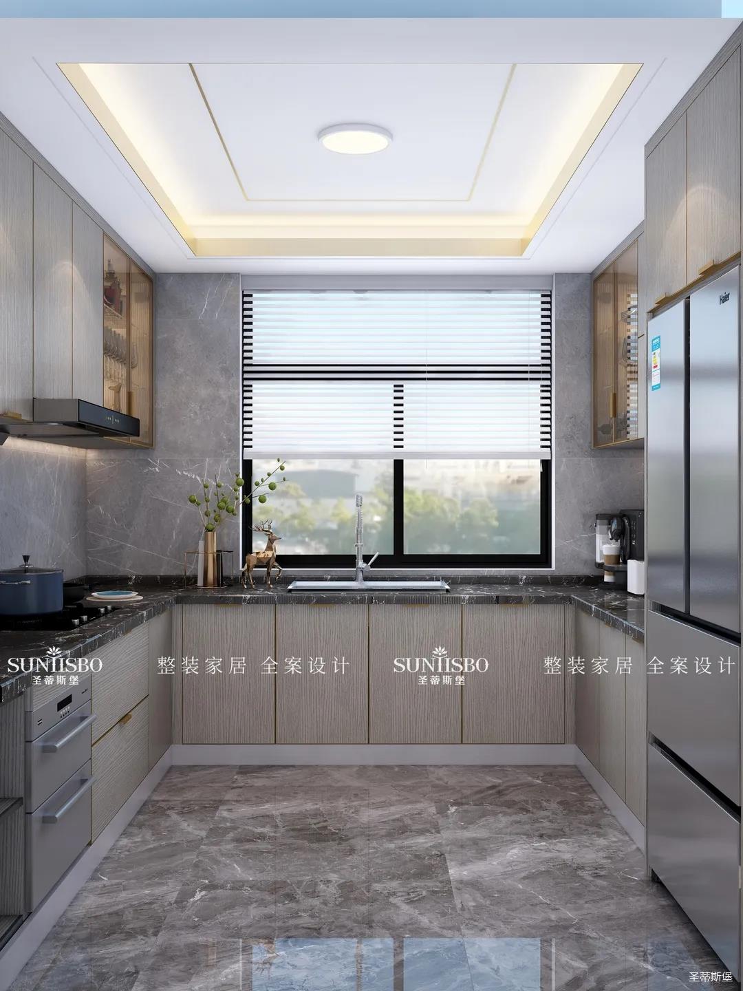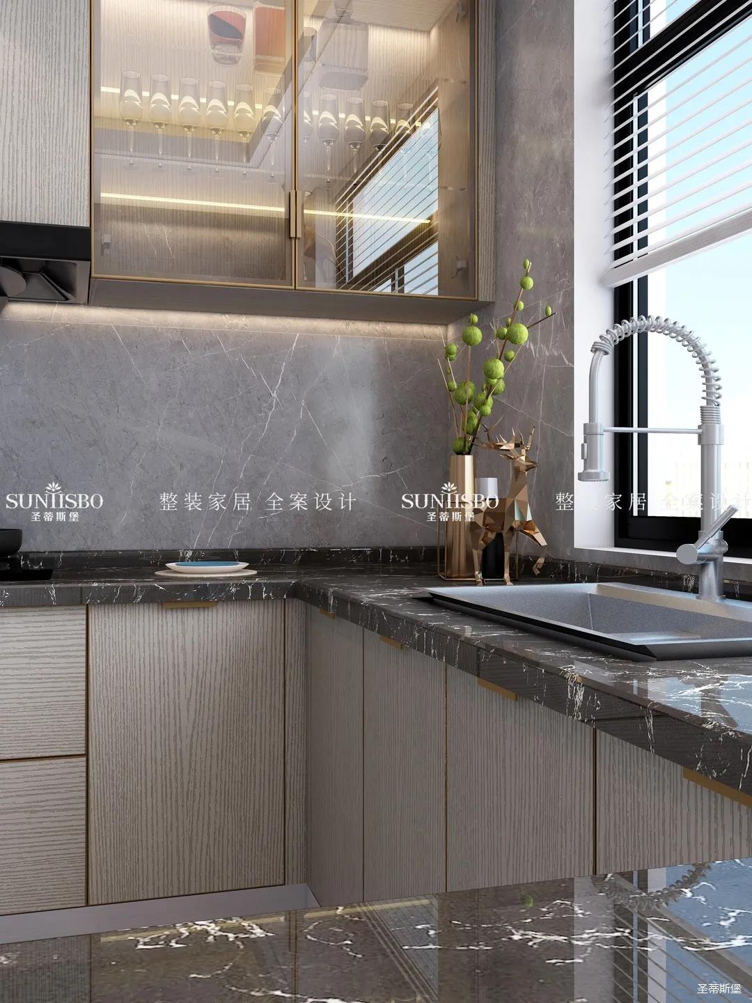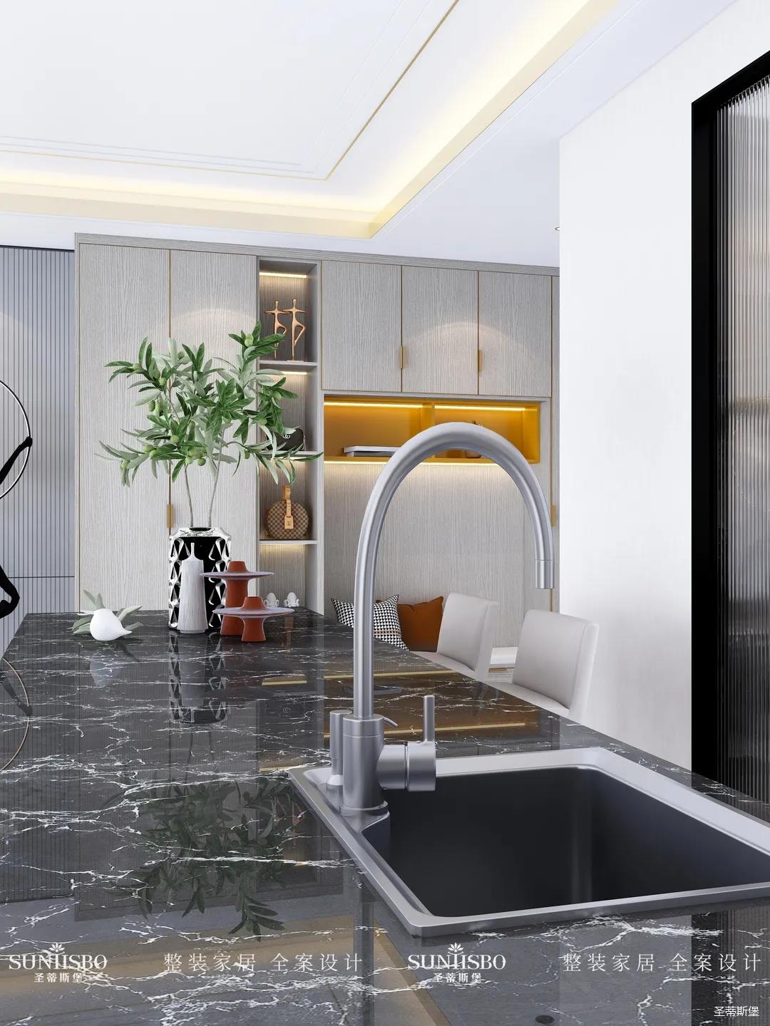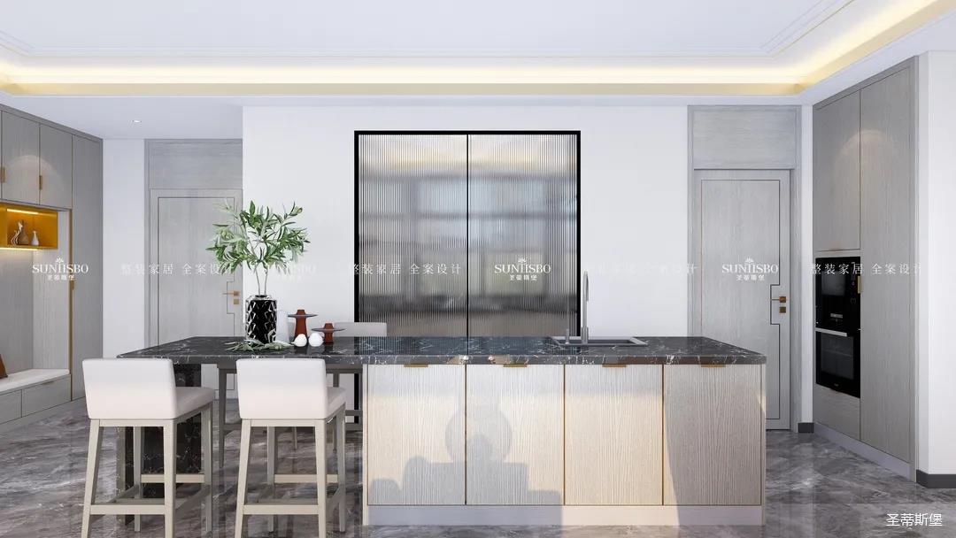 設(shè)計(jì)師以廚房&西廚區(qū)為布局的中軸,打開左右空間,延伸出廚房動線功能區(qū),增加西廚區(qū)域,有效延伸空間。設(shè)計(jì)師打造了下午茶專屬的中島臺,中島臺與客廳串連,方便屋主隨時(shí)分享美食樂趣。