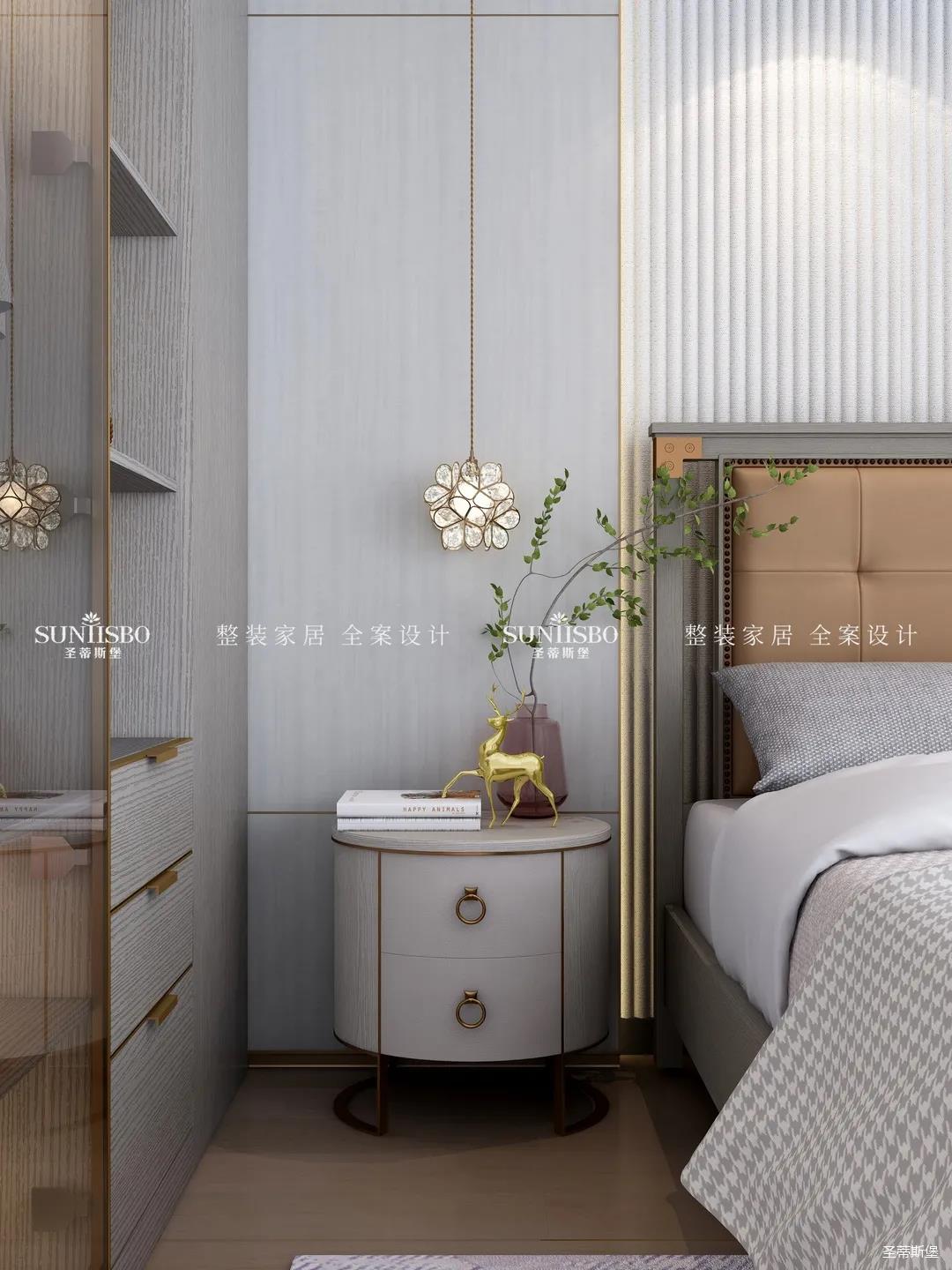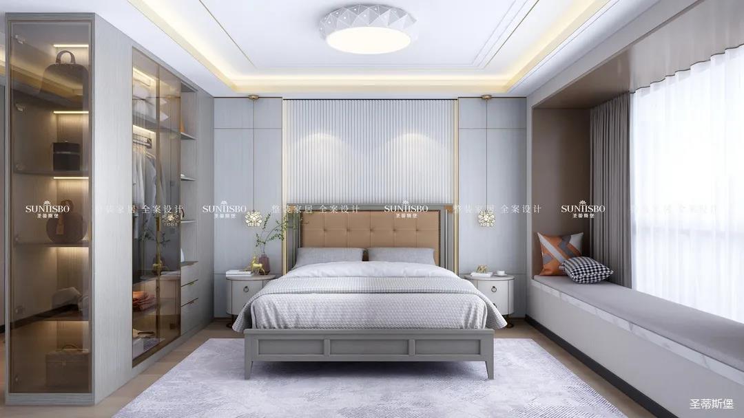 精于思而展于型,主臥將浮華的裝飾剔除,裝飾線連接各個區(qū)域,強(qiáng)調(diào)了空間的節(jié)奏與韻律。運(yùn)用時(shí)尚灰大面積展現(xiàn)著高級感,讓不同色彩的家具結(jié)合,營造出與眾不同的韻感與雅致,給人良好的睡眠體驗(yàn)。