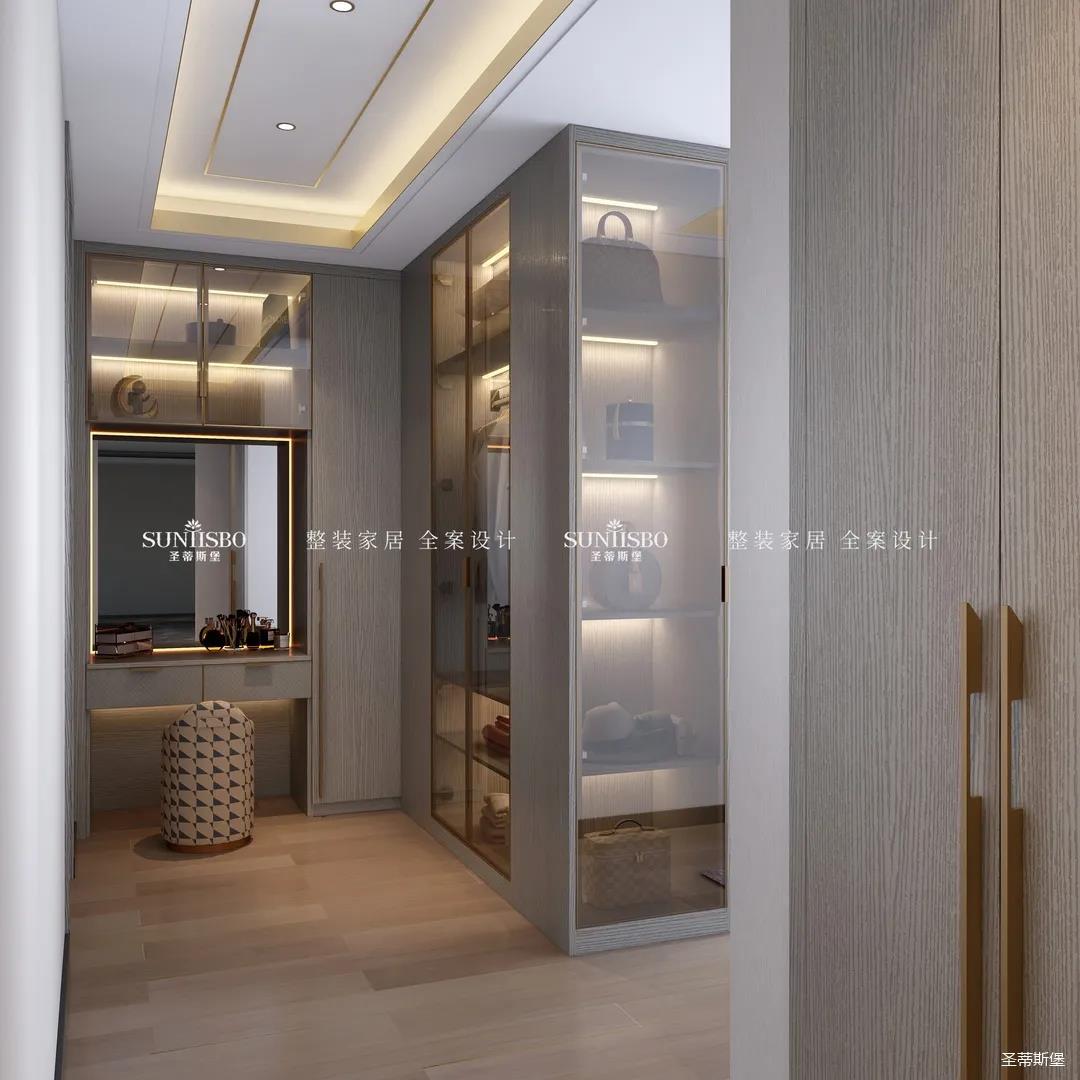 半開放式衣帽間分隔了主臥與梳妝兩個獨(dú)立空間,金色是詮釋華貴最直接的表達(dá),將金屬鑲嵌于玻璃材質(zhì)與實(shí)木之間,令空間光芒透射加倍。