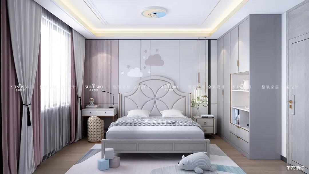 兒童房以粉白為基調(diào),醞釀著世間充滿童真和浪漫的語言。四照花型的床屏,讓人聯(lián)想到被粉色鮮花包圍的公主王國。封閉式的收納衣柜增加了開放式的兒童玩偶展示區(qū),溫馨又浪漫,讓小孩在童話王國里長大。